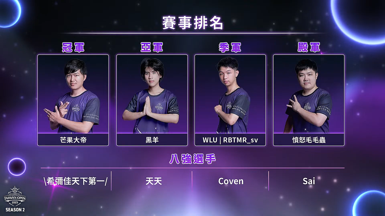 | Candy9903 (6692) | 小神 (7778) | Dex (0988) | 唐愛音 (2749) |